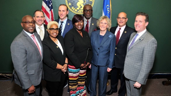 Pictured are (from left to right, front row) District 2 Freeholder Vice President Wayne Richardson, Freeholder At-Large Romaine Graham, District 3 Freeholder Tyshammie L. Cooper, Freeholder At-Large Patricia Sebold, and Freeholder President At....
