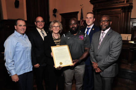 Pictured are (from left to right), Freeholder Carlos M. Pomares of District 5, Freeholder Robert Mercado of District 1, Freeholder At- Large Patricia Sebold, Coach Lance T. Wigfall, Freeholder Leonard M. Luciano of District 4, Freeholder Vice Pres....